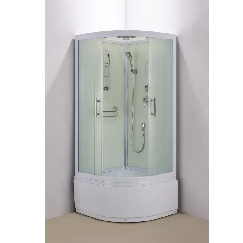 Душевая кабина Водный мир имеет размер 100х100 см. Форма — четверть круга , цвет белый, исполнение полотна двери матовое. Механизм открывания раздвижной.